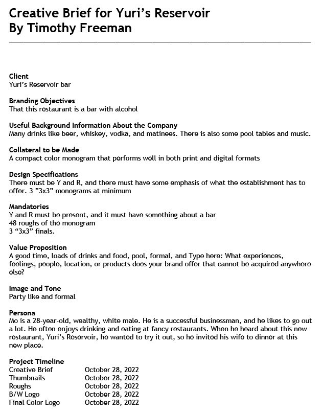 A creative brief that was made in Adobe InDesign, I do not like these things because of how much information I need to find that is accurate.