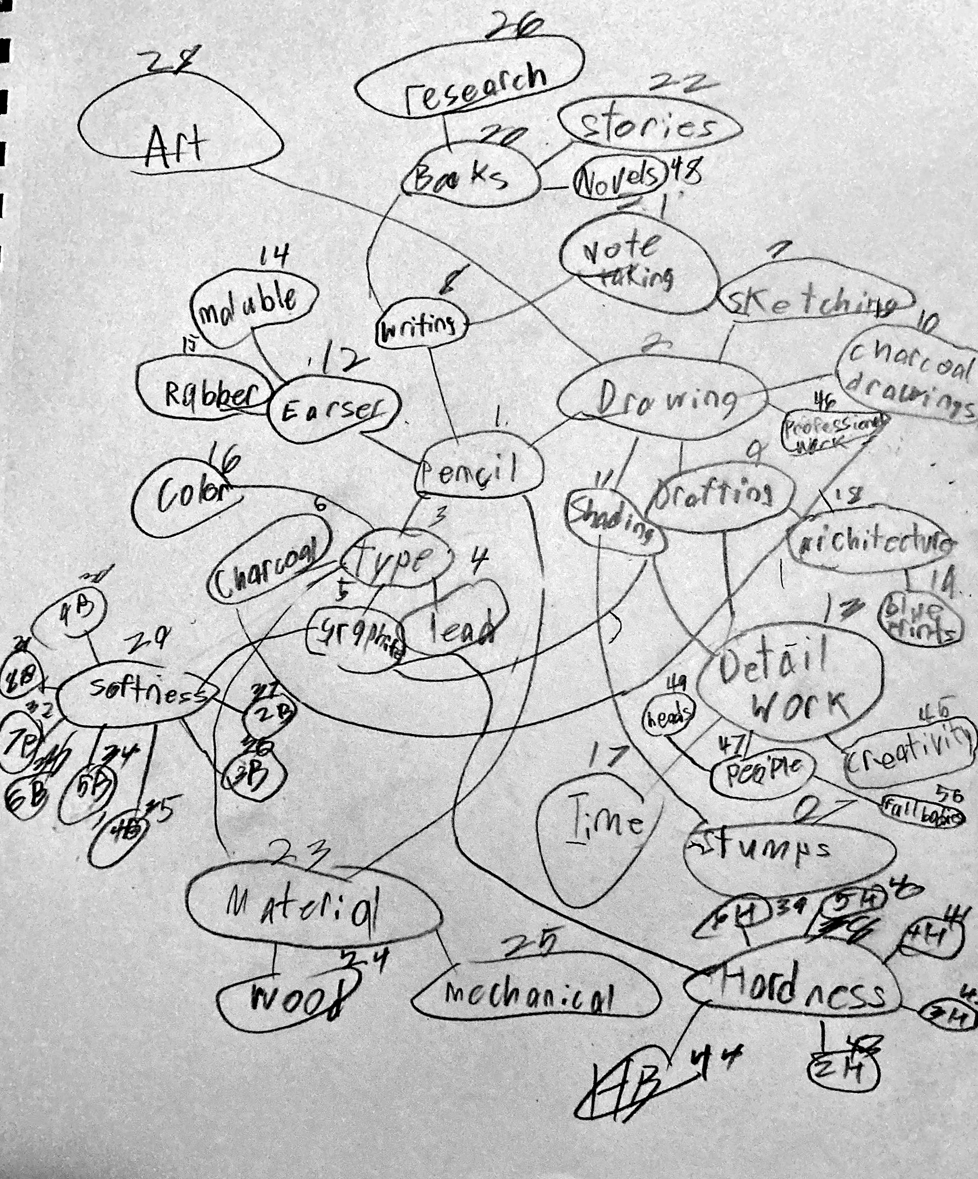 A mind map for it before starting the thumbnails. This was my least favorite part of the project due to the jumble messiness of this page.